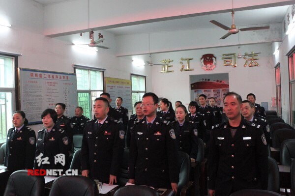 芷江县司法局全体干警起立唱国歌。