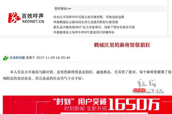 11月8日和9日,网友“哈哈047”和“太多的问题” 分别以《怀化某大酒店从事卖淫活动》和《鹤城区里的麻将馆很猖狂》为题,在红网百姓呼声栏目鹤城区版块发帖举报。鹤城公安相关领导立即要求辖区派出所开展调查。