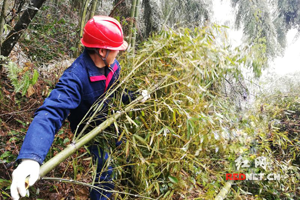 国网洪江市供电公司抢修人员在塘湾镇羊皮洞村清理压在10千伏线路上的树障。