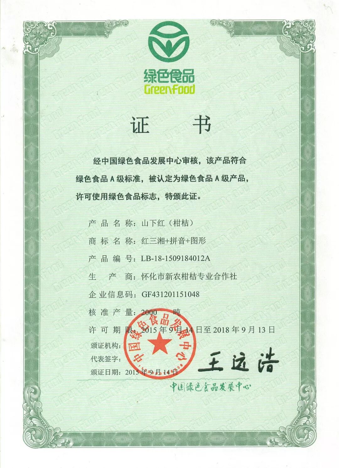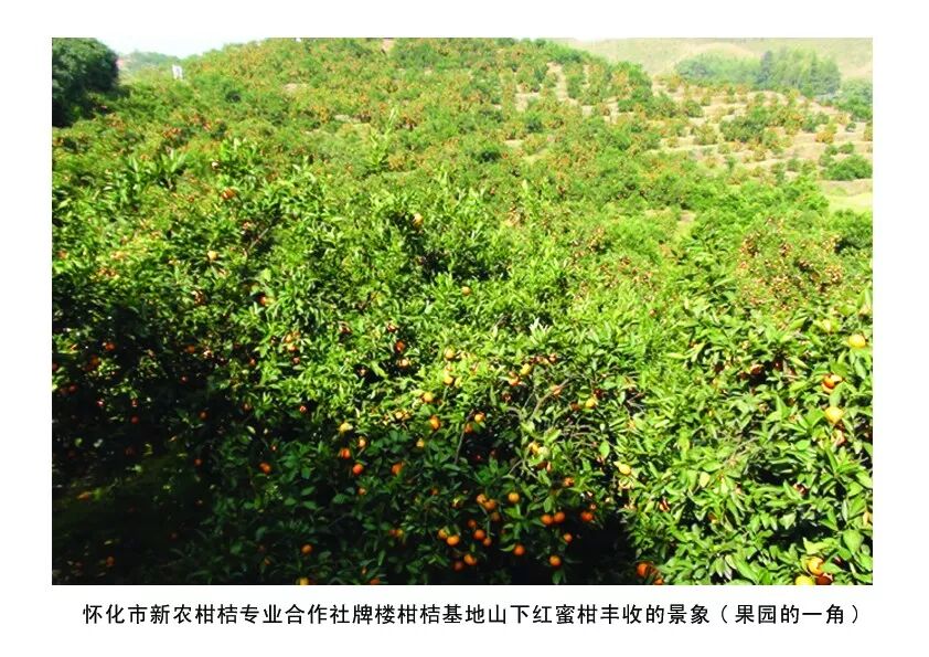 怀化市新农柑桔专业合作社(以下简称柑桔社)成立于1997年10月,集柑桔的种植生产、储存加工、营销和技术服务于一体,主要柑桔品种有:山下红蜜柑、冰糖橙、脐橙等。柑桔社采取“专业社+基地+农户”的模式,在中方县中方镇、桐木镇建立了面积达5000亩的柑桔品改核心示范基地,引进了山下红蜜柑等优质柑桔品种,实施柑桔品种改良,带动了大批果农积极实施柑桔品改。积极推进柑桔采摘后的商品化加工,通过注册“舞水”、“红三湘”牌商标 ,实施品牌带动,并取得国家绿色食品认证。