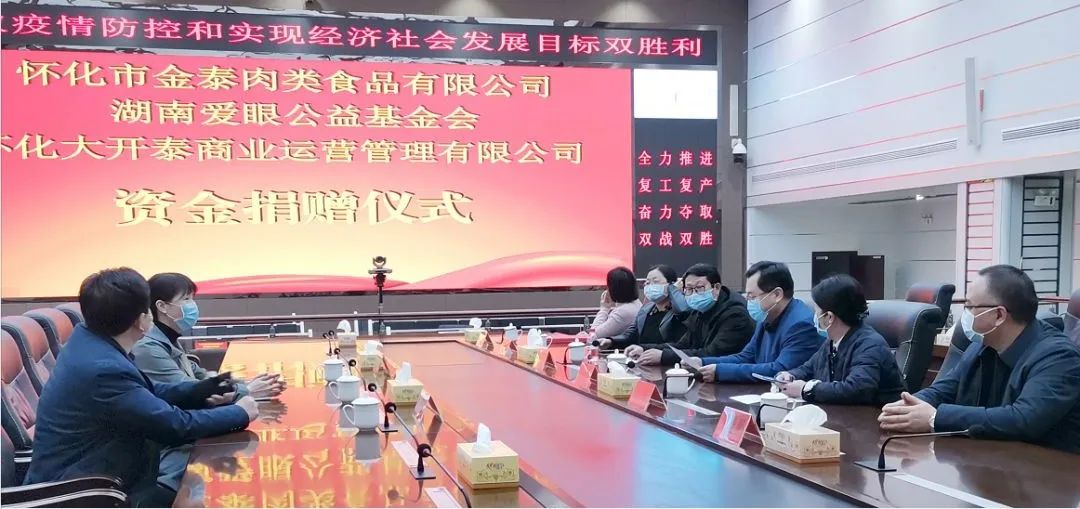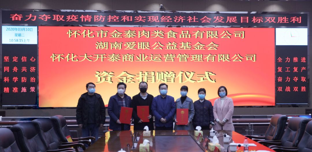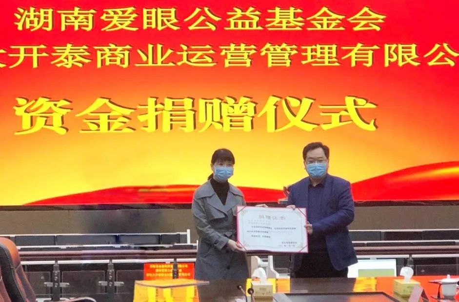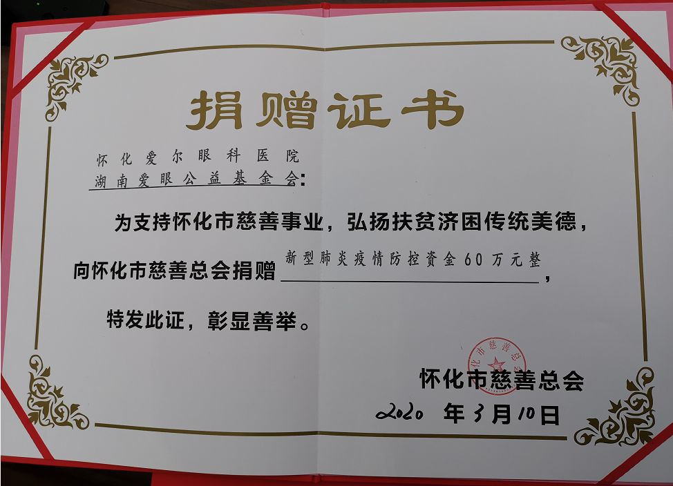 捐赠仪式上,怀化爱尔眼科CEO唐健娥代表湖南爱眼公益基金会、怀化地区五家爱尔眼科医院,向怀化市慈善总会捐赠60万元用于疫情防控工作。她表示:“为响应国家号召,关爱抗疫一线医务工作者及基层抗疫工作人员,由爱尔眼科集团湖南省区联合湖南省各地爱尔眼科医院发起的新冠肺炎疫情公益捐赠,将向一线工作者带去一份关怀。”