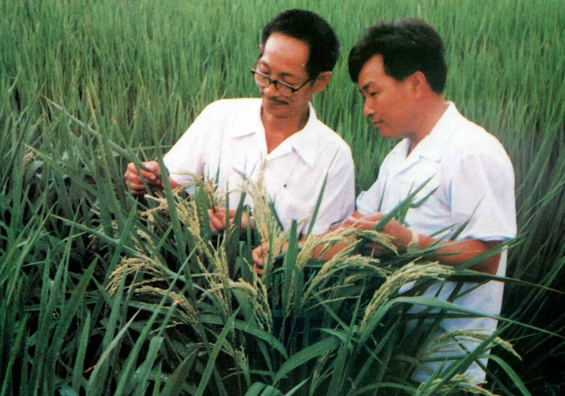 (“杂交水稻之父”袁隆平院士(左)和李必湖研究员在一起观察杂交水稻。)