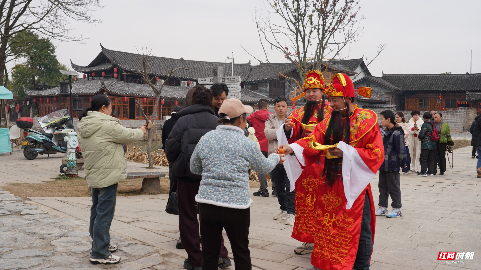 游客们不仅能从“财神爷”手中接过象征吉祥的糖果,还能参与趣味十足的成语接龙游戏,答对者即可获得财神送上的新春红包,古村内热闹喜庆,笑声不断。
