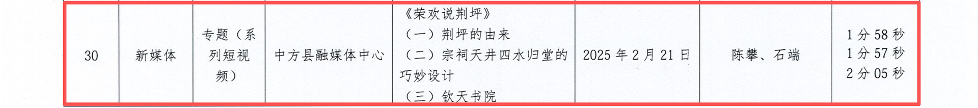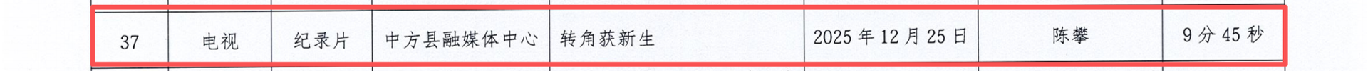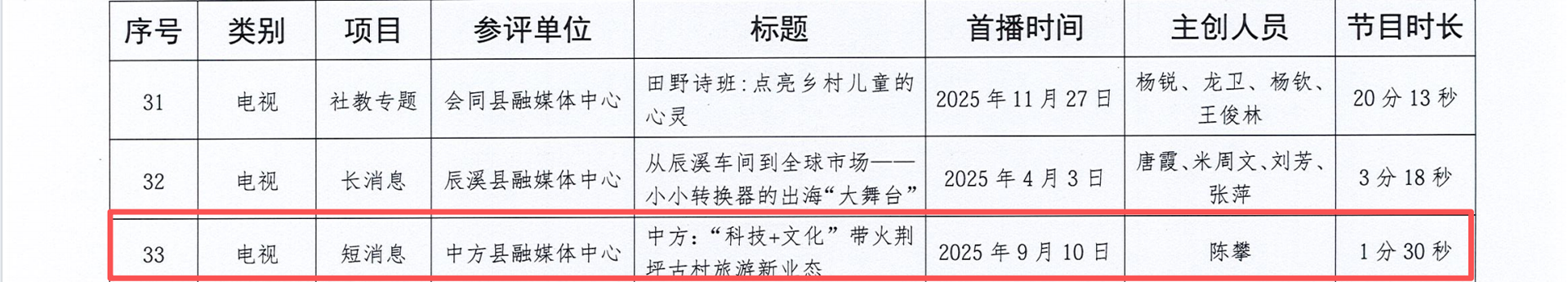 红网时刻新闻2月4日怀化讯(通讯员 杨丽群)近日,怀化市广播电视学会对2025年度“怀化广播电视奖”的各类参评作品进行评审,共评选出2025年度“怀化广播电视奖”优秀作品102件,其中一等奖25件,二等奖31件,三等奖46件。中方县融媒体中心记者作品《传统节日里的中方系列微电影》《一块砖的“守望”》荣获一等奖;《荣欢说荆坪》荣获二等奖;《中方:“科技+文化”带火荆坪古村旅游新业态》《转角获新生》《中方籍球员张志豪:做好人踢好球,我与家乡共成长》荣获三等奖。