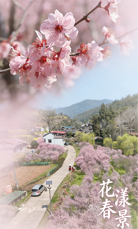 穿村而过的溪水映照着两岸桃林,花瓣随波逐流,带着春日的清甜奔赴远方。临水的木栈道落满粉白,踏青的游人穿行其间,惊起枝上粉蝶翩跹。古寨石阶被春雨润得发亮,青苔在石缝间探头,与桃花相映成趣。