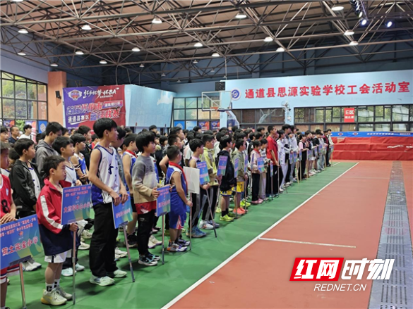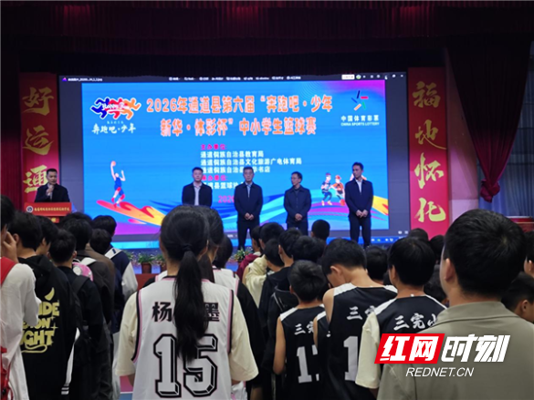 红网时刻新闻4月27日怀化讯(通讯员 杨萃)4月27日上午,2026年通道县第六届“奔跑吧·少年新华·体彩杯”中小学生篮球赛开幕式在通道县思源学校室内篮球场举行。本次赛事由通道县教育局、通道县文化旅游广电局、通道县新华书店联合主办,通道县篮球协会承办,旨在深入推进素质教育,丰富中小学生课余生活,锤炼青少年意志品质,全县各中小学代表队齐聚现场,共赴这场青春昂扬的篮球盛会。