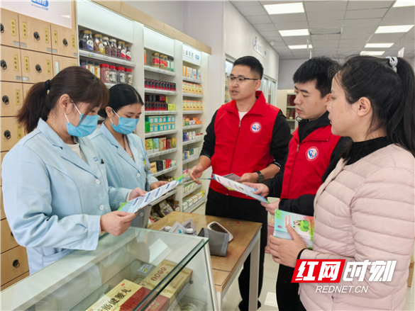 工作人员向周边定点零售药店开展医保基金相关政策解读(周悦伊 摄)