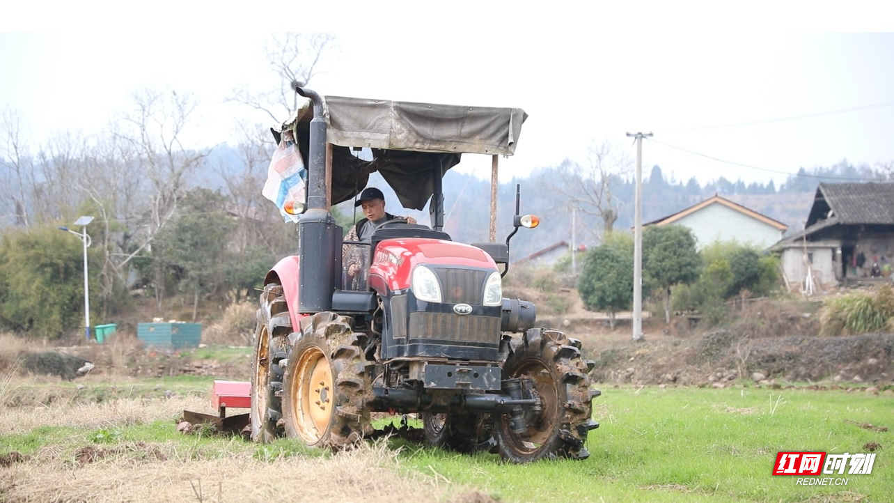 在大合坪乡大合坪村,一台四驱大型四轮旋耕机轰鸣作响,在田间不断翻耕作业,这是种植大户佘高昆正在翻耕水田,为春耕插秧做好准备。今年是佘高昆扭转土地种粮的第三年,种植面积将增加到200亩,希望收获一个丰收年。