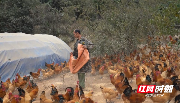 红网时刻新闻10月28日怀化讯(通讯员 梁洁 黄杰华)10月27日,走进新建镇四卧龙村的养鸡场,漫山遍野的土鸡或在枝头栖息,或在林下觅食,此起彼伏的鸡鸣声奏响了乡村振兴的动人乐章。养殖户蒲宏建正忙着撒喂玉米饲料,林间不时传来清脆的鸡鸣声,作为当地小有名气的林下养殖大户,他通过林权流转盘活闲置林地,用“林禽共生”的致富经带动乡村产业发展。
