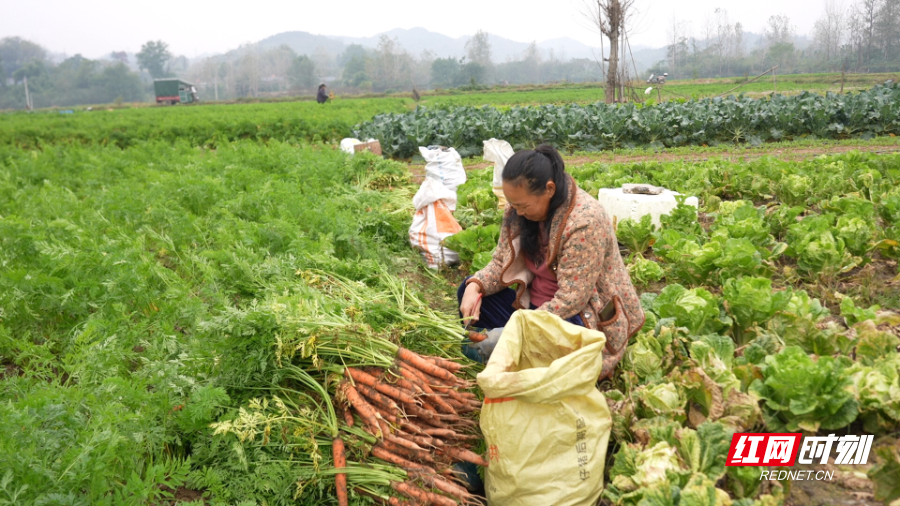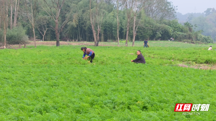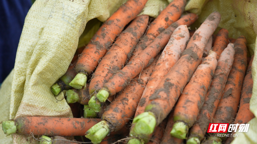 红网时刻新闻11月20日怀化讯(通讯员 杨森)眼下正值胡萝卜采收旺季,11月19日,在中方县中方镇岩头园村胡萝卜种植基地内,处处是村民忙碌的身影。绿油油的田间,大家穿梭其间,攥住翠绿叶杆轻轻一拔,饱满橙红的胡萝卜便带着沙土破土而出,随后村民将其剪掉茎叶、装入麻袋,待清洗干净后,即刻发往怀化城区及深圳等地市场。